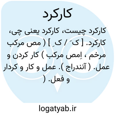 ۱ - ( مصدر ) کار کردن عمل [ چه گویم از ین گنبد تیز گرد که یک دم نیا ساید از کار کرد ]. ۲ - ( صفت ) کار انجام داده عمل: [ دانم که از خدمتگزاران تو بیرون نیست و این کار کرد شماست ]. ( سمک عیار ۳ ) ۲۶۴: ۱ - کار کردار فعل: [ میانه گزین در همه کار کرد بپیوستگی هم بننگ و نبرد ] ۴ - صنع مصنوع ساخته عمل کرد: [ میان سنگ یکی کنده کنده کرد حصار نه زان عمل که بود کار کردهای بشر ]. ( فرخی ) ۵ - ( اسم ) زحمت مزاحمت.