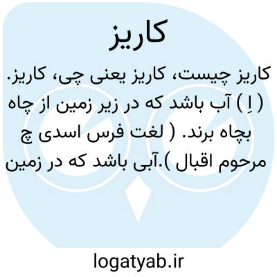 ( اسم ) ۱ - مجرای آب در زیر زمین قنات: [ کسانی که شهرها و دیه ها و بناها و کاریزهاساختند... بگذاشتند و برفتند ]. ( بیهقی ) ۲ - بر گریز بر گریزان ( قس. کهریز ): [ خونریز شاخدار خوش آمد بروز عید در موسمی که باشد کاریز شاخسار ]. ( سوزنی )