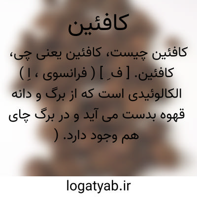 ( اسم ) آلکالوئیدی است که در برگ و دان. قهوه و چای و گیاه ماته و گیاه کلا اکومیناتا موجود است. کافئین نخستین بار در سال ۱۸۲٠ م. توسط رونژ در آلمان بدست آمد و بعدها در سال ۱۸۶۱ م. رابطه اش با تئوبرومین ( آلکالوئید موجود در کاکائو ) مشخص گردید. کافئین مقوی قلب و مدر است و در ضعف قلب و بیماریهای عفونی ( تیفوئید - ذات الریه ) مصرف میشود متیل تئوبرومین تری میتل گزانتین. توضیح آلکالوئید موجود در برگ چای که بنام تئین مشهور است همان ترکیب کافئین را دارد و عینا همان اثرات فیزیولوژیکی و فیزیکی و شیمیایی را دار است. بدین جهت امروزه هر دو را یکی میدانند و بهمان نام کافئین میخوانند و ضمنا تئین یا کافئین رابط. نزدیکی با تئوبرومین آلکالوئید موجود در گیاه کاکائو دارد. از این رو گاهی نام شیمیایی کافئین را متیل تئوبرومین نیز نامند.