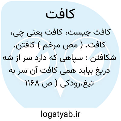 حور یا روح که باشد که کفوی تو بود.سنائی ( دیوان چ مدرس رضوی، ص 870 ).بقاء کافه وحوش به دوام عمرملک بسته است. ( کلیله و دمنه ). واجب است بر کافه خدم و حشم ملک که آنچه ایشان را فراهم آید در نصیحت باز نمایند. ( کلیله و دمنه ). از جملگی لشکر و کافه نزدیکان وی [ شیر ] درگذشت ( کلیله و دمنه ) لیکن منافعاین دو خصلت کافه مردمان را شامل گردد. ( کلیله و دمنه ). فواید موافقت و عواید معاضدت ایشان به اهل اسلام و کافه خلق رسید. ( ترجمه تاریخ یمینی ص 292 ). کافه اهل اسلام بدان شادیها نمودند. ( ترجمه تاریخ یمینی ص 26 ). کافه خلق در پناه عصمت و حجر امن و کنف امان بیاسودند. ( ترجمه تاریخ یمینی ص 367 ). لاجرم کافه انام از خواص و عوام به محبت او گرائیده اند. ( دیباچه گلستان ). حق سبحانه و تعالی محمد علیه السلام را به کافه مردم فرستاد. ( تاریخ قم ص 207 ). || ( ص ) ناقه پیر. ( المنجد ). کاف. ناقه که پیر شود و دندانهاش کوتاه و سوده گردد. ( از اقرب الموارد ). شتر سوده دندان و کوتاه شده از پیری. ( منتهی الارب ).