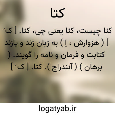 کتا. [ ک َ ] ( هزوارش، اِ ) به زبان زند و پازند کتابت و فرمان و نامه را گویند. ( برهان ) ( آنندراج ).