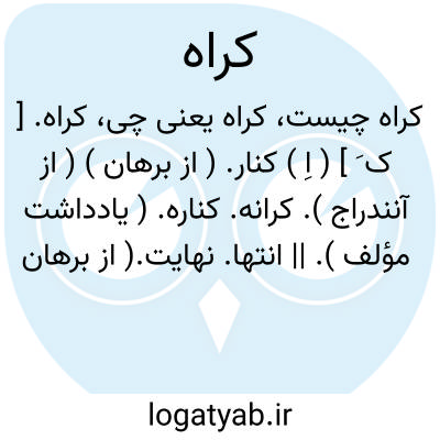 کراه. [ ک َ ] ( اِ ) کنار. ( از برهان ) ( از آنندراج ). کرانه. کناره. ( یادداشت مؤلف ). || انتها. نهایت.( از برهان ) ( از آنندراج ). انجام. ( یادداشت مؤلف ). || افق. کناره آسمان. ( یادداشت مؤلف ).
