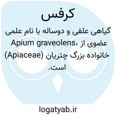 ( اسم ) گیاهی است علفی و دو ساله از تیر. چتریان بارتفاع ۲٠ تا ۶٠ سانتیمتر که در اکثر نقاط خصوصا در نواحی بحر الرومی ( و همچنین ایران ) فراوان است. این گیاه جزو سبزیها ی خوراکی است و در اغذیه مصرف میشود. ریشه اش راست و خاکستر ی قهوه یی و درونش سفید رنگ است. ساقه اش مایل برنگ سبز بی کرک است و برگها شفاف و اندکی ضخیم میباشند. گلها یش کوچک و سفید مایل بزردند. میوه اش کوچک و قهوه یی رنگ و دارا ی خطوطی سفید است. ریشه و برگ میو. این گیاه در تداوی مورد استعمال دارد. برگ گیاه مذکور ضد اسکوربوت و شیر. آن بعنوان مقوی و ضد تب بکار میرود کرویز اپیوس کرفشا اوداسالیون سلزی سلدهری اجمود. یا کرفس آبی. یکی از گونه های کرفس است که در کنار مردابها میروید و در تداوی بعنوان مدر و ضد اسکوربوت بکار میرود کرفس المائ جرجیر المائ قره العین. یا کرفس بری. یا کرفس بستانی. یا کرفس بیابانی. یا کرفس تربی گونه ای کرفس که ریشه ای مانند چغندر یا ترب مواد غذایی اندوخته میکند و حجیم میشود. ریشه اش را مانند ترب و چغندر میخورند کرفس شلغمی کرفس لفتی شلغمی کرویزی کرفس ریشه. یا کرفس جبلی. یا کرفس خوراکی. یا کرفس رومی. یا کرفس ریشه. یا کرفس زراعتی. یا کرفس شلغمی. یا کرفس صحرایی. گونه ای کرفس خود رو که در مزارع میروید و در تداوی مصرف میشود کرفس بری کرفس بیابانی سمرینون خرس گیاه کرفس وحشی. توضیح: گونه ای از این نوع کرفس که در کنار مردابها و رود خانه ها میروید بنام کرفس آبی مشهور است. یا کرفس عطری. گونه ای کرفس که دارا ی گلها ی سفید و ساق. مخطط و برگها ی نرم است. گلها ی این گونه کرفس دارا ی عطری مطبوع میباشد کرفس مشک یا کرفس فرنگی. نوعی کرفس که در زمان ناصر الدین شاه از اروپا بایران وارد شد و رواج یافت ( الماثر و الاثار ). یا کرفس کوهی. گونه ای کرفس که در دامن. تپه ها و نواحی کوهستانی میروید و مانند کرفس بیابانی در تداوی بعنوان مدر ضد اسکوربوت مصرف میشود کرفس جبلی کرفس الجبل داغ کرویزی. یا کرفس لفتی. یا کرفس مشک. یا کرفس معمولی. یا کرفس نبطی. یا کرفس وحشی.