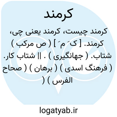 کرمند. [ ک َ م َ ] ( ص مرکب ) شتاب. ( جهانگیری ). || شتاب کار. ( فرهنگ اسدی ) ( برهان ) ( صحاح الفرس ) ( ناظم الاطباء ). تند و تیز. ( جهانگیری ) ( برهان ).سخت. ( جهانگیری ). چالاک. ( ناظم الاطباء ):