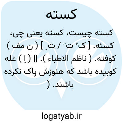 کسته. [ ک ُ ت َ / ت ِ ] ( ن مف ) کوفته. ( ناظم الاطباء ). || ( اِ ) غله کوبیده باشد که هنوزش پاک نکرده باشند. ( برهان ) ( آنندراج ) ( انجمن آرا ). غله و برنج کوفته که هنوز پاک نکرده و کاه و پوست آن را نگرفته باشند. ( ناظم الاطباء ). || به فارسی عصی الراعی است. ( فهرست مخزن الادویه ). رستنیی که سرخ مرد و به تازی عصی الراعی نامند. ( ناظم الاطباء ). سرخ مرد را نیز گویند و آن رستنیی باشدبه سیاهی مایل که عربان عصی الراعی خوانند. ( برهان ). || بقله یمانیه که به هندی چولای نامند و گفته اند که آذان الغز است. ( فهرست مخزن الادویة ).