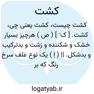 کشت. [ ک َ ] ( ص ) هرچیز بسیار خشک و شکننده و زشت و بدترکیب و بدشکل. || ( اِ ) یک نوع علف سرخ رنگ که بر روی زمین گسترده شده و می پیچد. || نمک. || ( ص ) نمکین. ( ناظم الاطباء ). || ( اِمص ) محو. حک. ( انجمن آرا ):