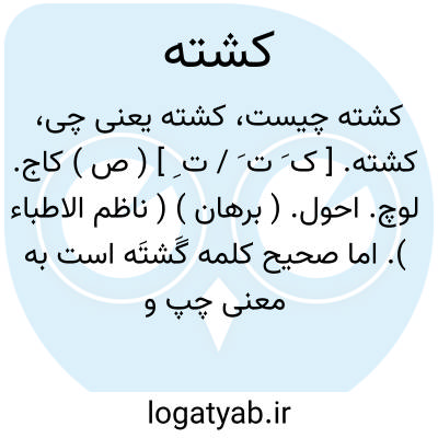 ( اسم ) ۱ - مقتول هلاک شده قتیل: ( افزون از سیصد چهارصد نفر در آن سردابه کشته دیدند... ). ( سلجوقنامه ) ۲ - خاموش شده ( چراغ و مانند آن ). ۳ - ( نرد ) مهره ای که بر اثر ضربت طرف موقتا از بازی خارج شده. ۴ - کسی که در بازی ( الک دو لک و غیره ) از بازی خارج گردد. ۴ - مشتاق. آرزومند عاشق: فلان کشت. این دختر است جمع: کشتگان: و همه اره از کشتگان تلال و هضاب ساخت. یا کشت. سیماب. ۱ - سیمابی که بدارو ها کشته باشند و از آن اکسیر سازند. ۲ - سیماب غلیظ کرده که بر پشت آیینه طلا کنند: تیغ مینا رنگ خوبان را ز خون کردن چه باک ? کی کند آییه پنهان کشت. سیماب زا ? ( محمد سعید اشرف ) یا کشت. نفس. آنکه نفس خود را بمصداق [ موتوا قبل ان تموتوا ] کشته: ( زندگان کشته نفس آنجا کفن در تن کشان زعفران رخ حنوط نفس ایشان دیدهاند ). ( خاقانی )