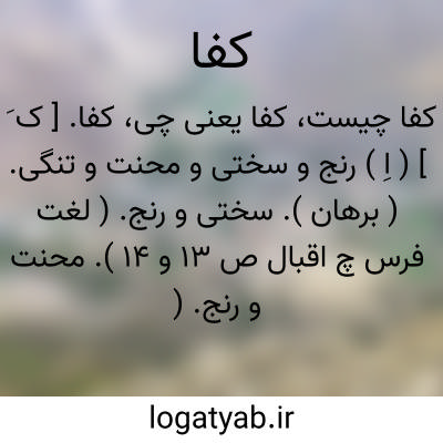 ( اسم ) ۱ - رنج و سختی محنت ( میر ابواحمد محمد خسرو ایران زمین آنکه شادست او و دورست از همه رنج و کفا ). توضیح: ن ل: آنکه پیش آرد در شادی چو پیش آید کفا.