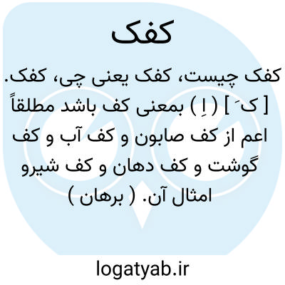 کفک. [ ک َ ] ( اِ ) بمعنی کف باشد مطلقاً اعم از کف صابون و کف آب و کف گوشت و کف دهان و کف شیرو امثال آن. ( برهان ) ( از غیاث ) ( آنندراج ) ( ناظم الاطباء ). زبد. ( دهار ) ( ترجمان القرآن ). تفل. تفال. ( منتهی الارب ). رغوه. کفچ. ( فرهنگ جهانگیری ):