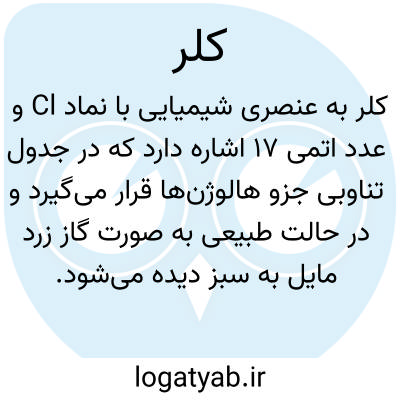 ( اسم ) شبه فلزی است زرد مایل بسبز در شرایط متعارفی گازی شکل با بوی خفه کننده و کمی سبک تر از هوا و بهمین جهت بصورت گاز خفه کننده در جنگ اول جهانی بکار رفته. تکاثف نسبی این گاز نسبت بهوا ۷۱/۲۹ ( معادل ۲/۴۹ ) است. بنابراین از هوا تقریبا دو و نیم مرتبه سنگین تر است. یک لیتر آب در ۸ درجه حرارت ۳/٠۴ لیتر آنرا در خود حل میکند. کلر را میتوان در حرارت ۱۵ درجه حرارت با فشار ۶ جو مایع کرد و در بطری چدنی سیفون دار ببازار عرضه نمود. کلر اول دفعه در سال ۱۷۴۷ م. وسیل. شیل از اثر جوهر نمک بربی اکسید منگنز بدست آمد. معمولا در صنعت کلر را از تجزی. الکتریکی نمک طعام بدست میاورند. کلر شبه فلزی است که با ظرفیت های مختلف با برخی شبه فلزات ( از قبیل فلوار و گوگرد و فسفر و سیلیسیوم ) و با ئیدوژن بشدت و با هم. فلزات ( حتی طلا و طلای سفید ) ترکیب میشود. جرم اتمی کلر ۳۵/۵ است.