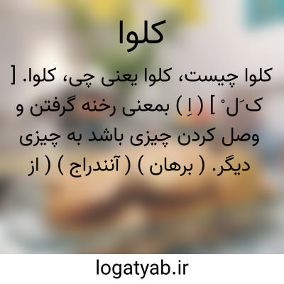 کلوا. [ ک َل ْ ] ( اِ ) بمعنی رخنه گرفتن و وصل کردن چیزی باشد به چیزی دیگر. ( برهان ) ( آنندراج ) ( از فرهنگ فارسی معین ). استاد آن کار را در اصفهان کلوایی گویند. ( حاشیه برهان چ معین ). در لهجه اصفهان به معنی بند زدن چینی و همان است که در خراسان آن را ورش زدن گویند. ( فرهنگ لغات عامیانه جمالزاده ). و رجوع به کلوابند و کلوایی شود. || در مؤیدالفضلا بمعنی غوک آمده است که وزغ باشد. ( از برهان ). || غوک و قرباغه. ( ناظم الاطباء ).