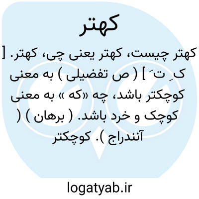 کهتر. [ ک ِ ت َ ] ( ص تفضیلی ) به معنی کوچکتر باشد، چه «که » به معنی کوچک و خرد باشد. ( برهان ) ( آنندراج ). کوچکتر و خردتر. ( ناظم الاطباء ). اصغر. مقابل مهتر. ( از یادداشت به خط مرحوم دهخدا ): پس شیرین را گفت او را برهنه کن تا همه اندام وی بنگرم. او را برهنه کرد، همه ٔاندام او درست بود مگر که گونه چپ او کهتر از آن ِ راست بود. ( بلعمی، از یادداشت به خط مرحوم دهخدا ).