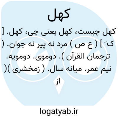 کهل. [ ک َ ] ( ع ص ) مرد نه پیر نه جوان. ( ترجمان القرآن ). دوموی. دومویه. نیم عمر. میانه سال. ( زمخشری )( از یادداشت به خط مرحوم دهخدا ). مرد سیاه سپیدموی باوقار، یا مرد میانه سال، یا آنکه از سی و سی وچهار درگذشته باشد تا پنجاه ویک رسیده باشد. گویند که مرد تاشانزده سال حدث است و از شانزده تا سی ودو، شاب و ازسی ودو تا پنجاه کهل، سپس ِ آن شیخ. ج، کهول، کهلون، کهال، کُهلان، کُهَّل. کهلةمؤنث، کَهلات و یا کَهَلات جمع. ( از منتهی الارب ) ( آنندراج ) ( از اقرب الموارد ). مردی که سنش بین سی تا پنجاه باشد. ( فرهنگ فارسی معین ). بزرگتر از شاب و خردتر از شیخ است، و آن از سی وپنج سالگی است تا چهل سالگی، و صاحب این سن را در تداول عامه، عاقل مرد و عاقله زن و گاهی عاقل و عاقله گویند. مرد میانه سال. ( از یادداشت به خط مرحوم دهخدا ): اذ قال اﷲ یا عیسی بن مریم اذکر نعمتی علیک و علی والدتک اذ ایدتک بروح القدس تکلم الناس فی المهد و کهلاً. ( قرآن 110/5 ).و یکلم الناس فی المهد و کهلاً و من الصالحین. ( قرآن 46/3 ). و کهل را به پارسی دوموی خوانند. ( ذخیره خوارزمشاهی، از یادداشت ایضاً ). و سیزده مرد از پیر و جوان و کهل در آنجا بر قفا خوابانیده. ( مجمل التواریخ، از یادداشت به خط مرحوم دهخدا ). ناگاه سواری پیداشد کهل و پیاده ای چند چالاک و مردانه در پیش این مردکهل روان شد... ( سمک عیار، از فرهنگ فارسی معین ).