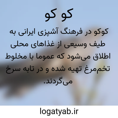 طوق در گردنند کوکوگوی.سنائی.|| ( اِ ) فاخته. ( ناظم الاطباء ). مرغی است که آوایی شبیه به کوکوبرآرد و بعضی ملل دیگر نیز همین نام را بدو دهند چنانکه فرانسوی ها. طیری از طیور که در لانه دیگران تخم گذارد و حضانت و تربیت جوجه های او را مرغان دیگر کنند. ( یادداشت به خط مرحوم دهخدا ). اسم صوت که به مرغ اطلاق شده. ( حاشیه برهان چ معین ). پرنده ای است ازراسته برشوندگان که زیبا و دارای منقاری ضعیف و بالها و دمش نسبتاً طویل و پاهایش کوتاه است. این پرنده از حشرات مختلف تغذیه می کند. رنگ پرهایش خاکستری متمایل به آبی و پرهای زیر شکمش روشن تر از قسمتهای دیگر بدن است. عاطفه مادری کوکو بسیار کم و مشهور به بی عاطفگی است و جوجه هایش نیز به قدرناشناسی شهرت دارند. وجه تسمیه وی به سبب آوازش ( که شبیه به «کوکو»است ) می باشد. فاخته. صلصل. ( فرهنگ فارسی معین ). || خاگینه را نیز گفته اند. ( برهان ). به معنی خورش خاگینه معروف است. ( انجمن آرا ). خاگینه. تواهه. ( فرهنگ فارسی معین ). || نوعی از مأکولات که از بیضه سازند. ( آنندراج ). نوعی از مأکولات که از بیضه مرغ سازند. ( غیاث ).طعامی که از گندنای کوبیده و جز آن با خایه زده درروغن سرخ کنند. قسمی از طعام با خایه مرغ و سبزی کوفته کرده. چون مطلق گویند، طعامی از خایه مرغ و گندنا و اگر با چیزی دیگر غیرگندنا باشد کوکو را بر آن اضافه کنند: کوکوی سیب زمینی. کوکوی بادنجان و غیره.( یادداشت به خط مرحوم دهخدا ). نوعی غذا. طرز تهیه آن معمولاً چنین است: چند دانه تخم مرغ را با قدری نمک و فلفل و یک قاشق آب در ظرفی ریزند و با چنگال آن را خوب هم زنند تا کاملاً صاف و یکرنگ شود. مقداری جعفری نرم کرده نیز داخل کنند و سپس مقداری کره یا روغن داغ کرده، تخم زده را در روغن ریزند و ظرف را کمی تکان دهند تا بدان نچسبد. همین که زیر آن سفت شد با کارد یا چنگال آن را به روی دیگر گردانند یا از یک طرف آن را لوله کنند تا اطراف آن سرخ شود، ولی میان نیمه بسته و نرم بماند و آتش ملایم به کار برند تا به خوبی طبخ صورت گیرد و زیاد سفت نشود. کوکو به سبب مخلوط شدن با سبزیها و حبوبات و گوشت انواعی دارد، مانند: کوکوی اسفناج، کوکوی بادنجان، کوکوی تره، کوکوی سبزی، کوکوی لوبیای سبز، کوکو شبت، کوکوی گوشت، کوکوی ماش و باقلا، کوکوی ماهی و غیره. ( فرهنگ فارسی معین ). || ( ادات استفهام ) تکرار «کو». کجاست ؟ کجاست ؟ ( یادداشت به خط مرحوم دهخدا ).