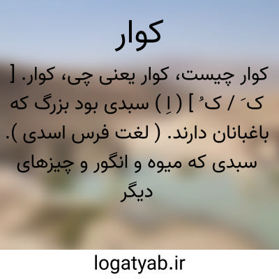 کوار. [ ک َ / ک ُ ] ( اِ ) سبدی بود بزرگ که باغبانان دارند. ( لغت فرس اسدی ). سبدی که میوه و انگور و چیزهای دیگر در آن کنند و بر پشت گیرند و از جایی به جایی برند و دو عدد آن را بر یک خر الاغ بار کنند و آن را به عربی دوخله خوانند. ( برهان ) ( آنندراج ) ( از ناظم الاطباء ). کواره: