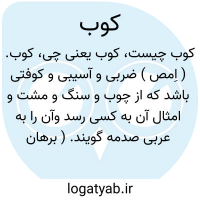 کوب. ( اِمص ) ضربی و آسیبی و کوفتی باشد که از چوب و سنگ و مشت و امثال آن به کسی رسد وآن را به عربی صدمه گویند. ( برهان ). ضربی که از کوفتن و کوبیدن به کسی رسد مانند سنگ و چوب که بر کسی زنند. ( آنندراج ). صدمه و ضربه و لطمه و ضرب. ( ناظم الاطباء ). ضربت. زدن. صدمه. آسیب. ( فرهنگ فارسی معین ). ضرب. زخم. ( یادداشت به خط مرحوم دهخدا ):