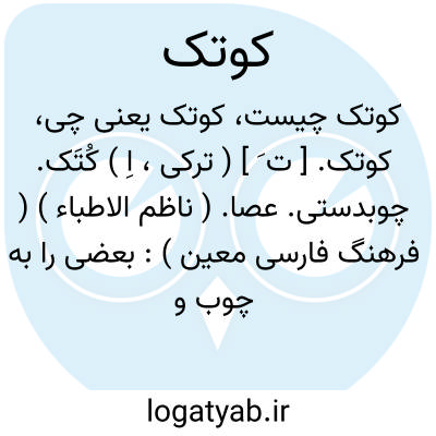 ( اسم ) ۱ - چوبدستی عصا: بعضی را بچوب و کوتک تادیب نموده و پاشا را از آن جهل و بد مستی ملامت کرده. ۲ - دست. هاون. ۳ - چوب گازران. ۴ - ضرب ( مطلق ) زدن ( چه با چوب و چه غیر آن ) کتک.