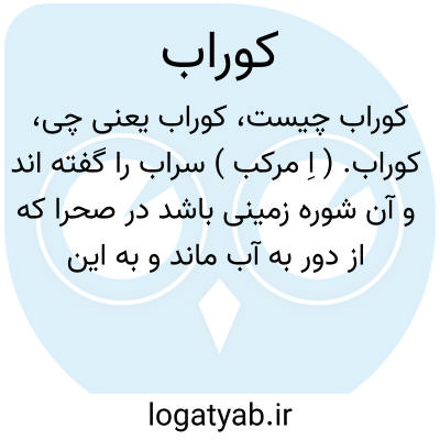 کوراب. ( اِ مرکب ) سراب را گفته اند و آن شوره زمینی باشد در صحرا که از دور به آب ماند و به این معنی با کاف فارسی هم آمده است. ( برهان ). بمعنی سراب یعنی زمین شوره که از دور آب نماید و چنان نباشد. ( آنندراج ). زمین شوره که از دور آب نماید. سراب. ( فرهنگ فارسی معین ). آل. ( مهذب الاسماء ). خیدع. ( منتهی الارب ). یلمع. ( ملخص اللغات حسن خطیب کرمانی ). گوراب. ( برهان ). کور. ( برهان ): سراب؛ کوراب و آن در نیمروز بینند. ( ترجمان القرآن ): احزال الجبل؛ بلند شد کوه بر کوراب. ( منتهی الارب ). اخفق السراب؛ جنبید کوراب و طپید. ( منتهی الارب ). و رجوع به گوراب و کور شود. || آبی همیشه جاری و سخت کم. آب جاری بسیار قلیل. ( یادداشت به خط مرحوم دهخدا ). || ( ص مرکب ) کسی را گویند که بسیار تشنه باشد و آب اندک خورد. ( برهان ) ( آنندراج ) ( ناظم الاطباء ).