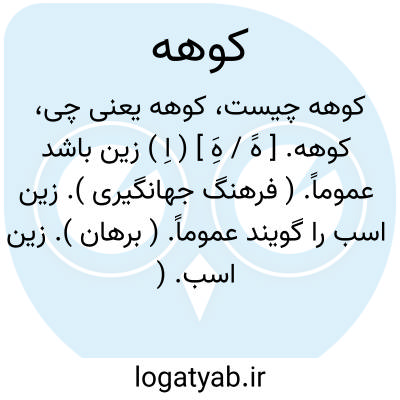 کوهه. [ هََ / هَِ ] ( اِ ) زین باشد عموماً. ( فرهنگ جهانگیری ). زین اسب را گویند عموماً. ( برهان ). زین اسب. ( ناظم الاطباء ) ( فرهنگ فارسی معین ). زین اسب را گویند عموماً و پیش زین را پیش کوهه و پس زین را پس کوهه، و اصل در این لغت بلند و بلندی است مانند کوه. ( آنندراج ):