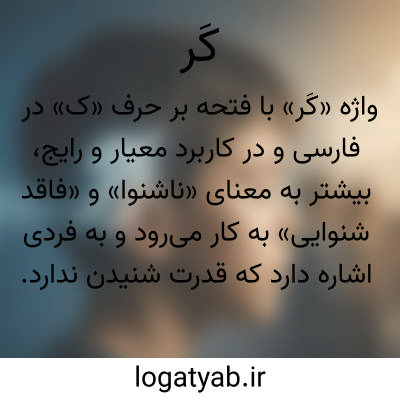 واژه «کَر» با فتحه بر حرف «ک» در فارسی و در کاربرد معیار و رایج، بیشتر به معنای «ناشنوا» و «فاقد شنوایی» به کار می‌رود و به فردی اشاره دارد که قدرت شنیدن ندارد یا دچار کم‌شنوایی شدید است. این واژه در متون کهن فارسی نیز به همین معنای ناتوانی در شنیدن دیده می‌شود و معمولاً در ترکیب‌هایی مانند «کر و لال» برای توصیف ناتوانی در گفتار و شنوایی به کار می‌رود. در برخی گویش‌های محلی، «کَر» می‌تواند معانی دیگری نیز پیدا کند، اما معنای اصلی و شناخته‌شده آن همان ناشنوایی است. این واژه در ادبیات فارسی گاهی به صورت استعاری نیز استفاده شده و برای بیان بی‌توجهی یا نشنیدن حقیقت به کار رفته است. در این حالت، منظور از «کر بودن» جسمی نیست، بلکه نوعی بی‌اعتنایی یا نپذیرفتن سخن حق است. از نظر زبانی، این واژه ساده و تک‌هجایی است و ریشه آن در فارسی و زبان‌های ایرانی کهن دیده می‌شود. در فرهنگ‌های لغت، «کَر» معمولاً در برابر «شنوا» قرار می‌گیرد و یک تقابل معنایی روشن ایجاد می‌کند. این واژه در پزشکی نیز برای اشاره به ناشنوایی به کار می‌رود و جنبه توصیفی دارد. بنابراین معنای اصلی «کَر» با فتحه، ناتوانی در شنیدن و فقدان حس شنوایی است. در نتیجه این واژه هم در کاربرد حقیقی و هم در کاربرد استعاری برای بیان نشنیدن یا بی‌توجهی استفاده می‌شود.