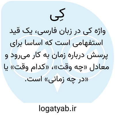 واژۀ کی در زبان فارسی، یک قید استفهامی است که اساساً برای پرسش درباره زمان به کار میرود و معادل «چه وقت»، «کدام وقت» یا «در چه زمانی» است. منابع لغتنامه، از جمله برهان و فرهنگ رشیدی، این نقش اصلی را تأیید کرده و آن را به عنوان ابزاری برای طلب تعیین زمان معرفی نمودهاند. این کلمه در ساختار جمله برای پرسش از زمان وقوع فعل به کار میرود؛ برای مثال، در جملاتی مانند «کی باشد؟» یا «کی آمد؟» منظور دقیقاً پرسش از زمان وقوع آن فعل یا حالت است. در گذشته، این کلمه همچنین گاهی در نقش استفهام برای بیان تمنا یا حتی انکار نیز به کار میرفته است.