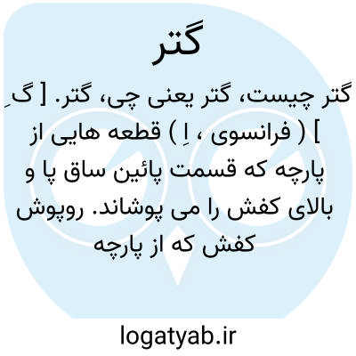 گتر. [ گ ِ ] ( فرانسوی، اِ ) قطعه هایی از پارچه که قسمت پائین ساق پا و بالای کفش را می پوشاند. روپوش کفش که از پارچه آن را میدوزند برای محافظت کفش از باران و برف و گل.