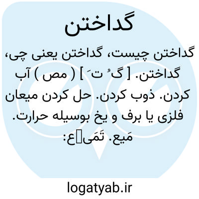 ( گداخت گدازد خواهد گداخت بگداز گدازنده گدازان گداخته گدازش ) ۱ - ( مصدر ) آب شدن فلز روغن موم و غیره بوسیل. حرارت ذوب شدن: هردو ( می و عقیق ) یک گوهرند لیک بطبع این بیفسرد و آن دگر بگداخت. ( رودکی ) ۲ - ( مصدر ) آب کردن فلز روغن و جز آنها بوسیل. حرارت: تو زرگری و من زر بگداختی مرا زرگر چه کار دارد جز زر گداختن ? ( مسعود سعد ) ۳ - کاستن لاغر کردن: مگر کاندر بهشت آیی بحلیت بدین اندوه تن را چون گدازی ? ( ناصر خسرو )