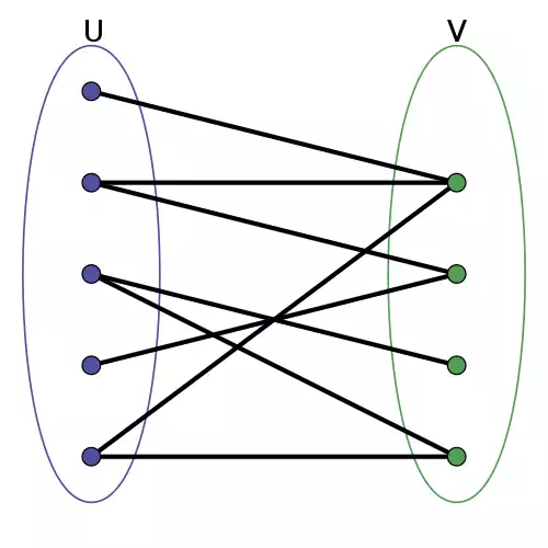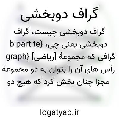 {bipartite graph} [ریاضی] گرافی که مجموعۀ رأس های آن را بتوان به دو مجموعۀ مجزا چنان بخش کرد که هیچ دو رأسی که به یکی از این مجموعه ها متعلق اند، به یکدیگر وصل نشوند
