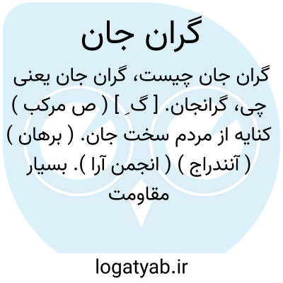 بسیار مقاومت کننده پوست کلفت سخت جان: حریف گران جان ناسازگار چو خواهد شدن دست پیشش مدار. ( گلستان ) ۲ - آنکه معاشرتش نامطبوع و گران آید مقابل سبکروح: توب. زهد فروشان گران جان بگذشت وقت رندی و طرب کردن رندان پیداست. ( حافظ ) ۳ - بسیار پیر سالخورده و رعشه ناک: گران جانی که گفتی جان نبودش بدندانی که یک دندان نبودش. ( نظامی ) ۴ - فقیر و بیمار از جان سیر آمد. ۵ - کاهل سست مقابل سبکروح. ۶ - لئیم پست خسیس بخیل: ای گران جان خوار دیدستی ورا زانکه بس ارزان خریدستی ورا. ( مثنوی ) ۷ - ( اسم ) آهار پالوده.