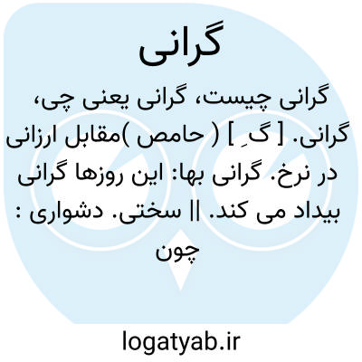 ۱ - پر قیمت بودن گرانبهایی مقابل ارزانی ۲ - سختی دشواری. ۳ - سنگینی ثقل مقابل سبکی: مثال نخستین گرانی و فروشدن که سنگ را از خویشتن بود. توضیح فرهنگستان این کلمه را بجای ثقل پذیرفته. یا گرانی دست و پا. سنگینی دست و پا خدرو استرخائ: و گرانی اندر پای چپ. یا گرانی شعر. سنگینی آن ناخوشایندی وی: و تفاوت نظم باعدم تناسب اجزا سبب گرانی شعر و موجب نبوت ذوق است. یا گرانی گوش. سنگینی گوش ثقل سامعه. ۴ - فراوانی انبوهی. ۵ - حاملگی آبستنی: گران بود و اندر شکم بچه داشت همی از گرانی بسختی گذاشت. ۶ - ناگواری کراهت گرانجانی: تو نازک طبعی و طاقت نداری گرانیهای مشتی دلق پوشان. ( حافظ ) یا گرانی طعام. ( غذا ). ناگواری دیر هضمی. ۷ - سرسنگینی: دل هارون بر برامکه بگشت و جعفر و یحیی را گران گرفت و یحیی هر روز از هارون گرانی میدیدی. ۸ - تکبر افاده: حیف بردن زکاردانی نیست با گرانان به از گرانی نیست. ( سعدی ) ۹ - کندی بطئ: و گرانی ایشان اندر رجوع همی افزاید بحد ایستادن بر جای رسد