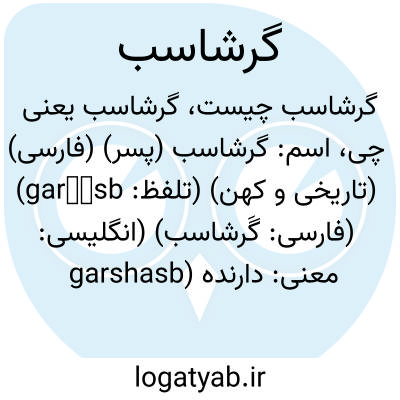 معنی: دارنده اسب لاغر، نام جهان پهلوان ایرانی، ( = کرشاسپ و گرشاشپ )، به معنی دارنده ی اسب لاغر، ( اَعلام ) ) ( در شاهنامه ) از پهلوانان ایرانی سپاه منوچهر در جنگ با سلم و تور و خزانه دار منوچهر، گرشاسبنامه سرگذشت اوست، ) آخرین شاه از سلسله ی پیشدادیان و پسر زو که نه سال پادشاهی کرد، ( در اعلام ) جهان پهلوان ایرانی پسر اثرط ( اترد ) پسر سام پسر تورگ پسر سپانیاسپ ( شیدسپ ) پسر دورشاسپ پسر توگ ( تور ) پسر فریدون و نیز پسر زو ( زاب ) دهمین پادشاه پیشدادی که نه سال پادشاهی کرد، از شخصیتهای شاهنامه، نام پدر نریمان جد رستم پهلوان شاهنامه، نیز نام پسر زو، از پادشاهان پیشدادی