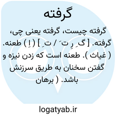 گرفته. [ گ ِ رِ ت َ / ت ِ ] ( اِ ) طعنه. ( غیاث ). طعنه است که زدن نیزه و گفتن سخنان به طریق سرزنش باشد. ( برهان ) ( آنندراج ). با لفظ زدن مستعمل است. ( آنندراج ):