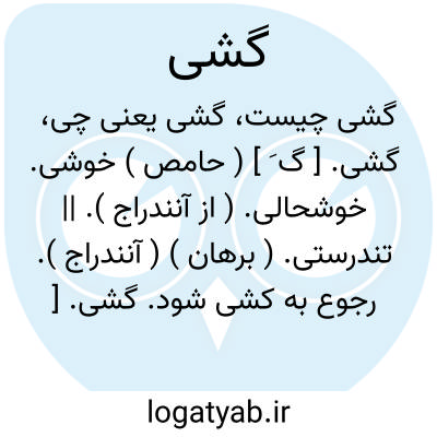 گشی. [ گ َ ] ( حامص ) خوشی. خوشحالی. ( از آنندراج ). || تندرستی. ( برهان ) ( آنندراج ). رجوع به کشی شود.