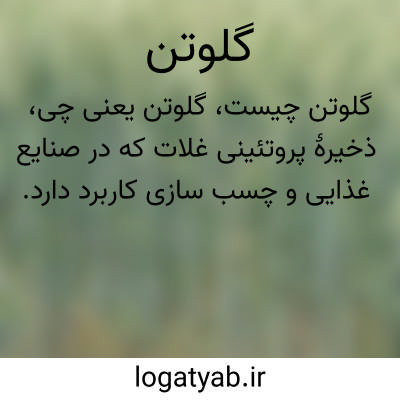 پروتئین موجود در غلات، به ویژه گندم و چاودار. گلوتن باعث می شود خمیر به هنگام ورز دادن منبسط شود. حساسیت نسبت به گلیادین، نوعی گلوتن، سبب بروز بیماری معده (سلیاک) می شود.