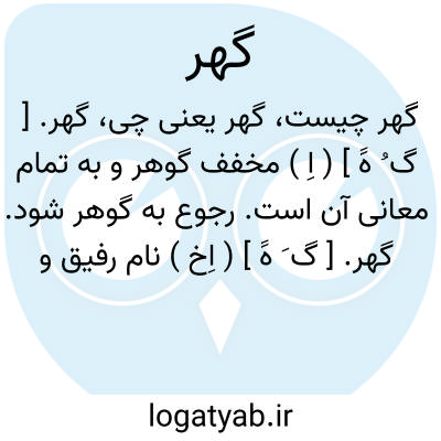 گهر. [ گ َ هََ ] ( اِخ ) دهی است از دهستان بویراحمدی گرمسیری بخش کهکیلویه شهرستان بهبهان. در کنار شوسه آرو به بهبهان. واقع در جلگه و هوای آن گرمسیر و سکنه آن 175 تن است. آب آن از رودخانه خیرآباد تأمین میشود. محصولات آن غلات، میوه، برنج، کنجد و لبنیات و شغل اهالی زراعت و حشم داری و صنایع دستی زنان قالیچه، جوال و گلیم بافی میباشد. ساکنان از طایفه بویراحمد گرمسیری هستند. ( از فرهنگ جغرافیایی ایران ج 6 ).