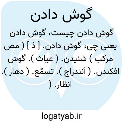 ( مصدر ) ۱ - گوش فرا داشتن نیوشیدن: تهمتن بگفتار او داد گوش پیاده بیامد برش با خروش. یا دل و گوش دادن. ۱ - گوش فرا دادن با رغبت: یکی جام یاقوت پرمی بچنگ دل و گوش داده باوای چنگ. ۲ - از دست دادن گوش فاقد قو. شنوایی شدن: گوش داده بود بطمع سرو داغ خورده بود بطمع کباب. ( قطران ) گوشدار. ( صفت ) ۱ - دارای گوش دارند. گوش دارای آلت شنوایی. ۲ - شنونده سامع: سروشت سال و مه اندر کنارست بگفتارت همیشه گوشدار ست. ( ویس ورامین ) ۳ - آنکه استراق سمع کند: رفتی و راز گفتی با دشمنان من وان کس که گوشدار توبود آن همه شنید. ( المعجم ) ۴ - متوجه مراقب. ۵ - محافظت کننده نگهبان حامی حمایت کننده: که چندین تن بنده شهریار که شان هست شاه جهان گوشدار... ( یوسف و زلیخا منسوب بفردوسی )