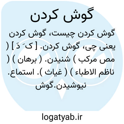 ( مصدر ) ۱ - شنیدن نیوشیدن گوش دادن. ۲ - با توجه شنیدن. توضیح برای فرق گوش کردن با شنیدن شنیدن. ۳ - استراق سمع کردن: آتشک گوش کرده بود و این سخنها می شنید. ۴ - آویز. گوش کردن و بکار بستن: نصیحت گوش کن کاین در بسی به ازان گوهر که در گنجینه داری. ( حافظ ) ۵ - منتظر بودن توقع داشتن: بچنگ آر و با دیگران نوش کن. نه بر فضل. دیگران گوش کن. ( بوستان ) ۶ - نگاه داشتن. ۷ - نگاهبانی کردن محافظت کردن. ۸ - تقلید کردن: کلاغی تک کبک را گوش کرد تک خویشتن را فراموش کرد. ( نظامی )