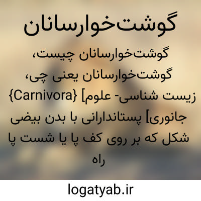 {Carnivora} [زیست شناسی- علوم جانوری] پستاندارانی با بدن بیضی شکل که بر روی کف پا یا شست پا راه می روند و بدنی بسیار انعطاف پذیر دارند و از جانوران دیگر تغذیه می کنند متـ. گوشت خواران