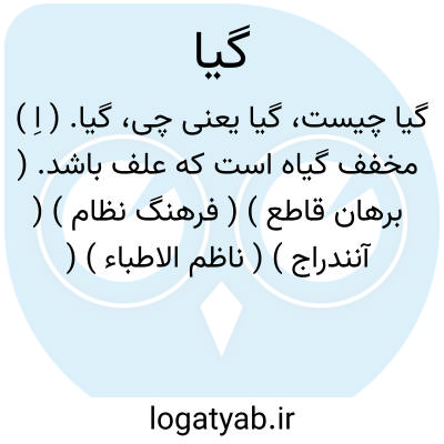 گیا. ( اِ ) مخفف گیاه است که علف باشد. ( برهان قاطع ) ( فرهنگ نظام ) ( آنندراج ) ( ناظم الاطباء ) ( غیاث اللغات ) ( فرهنگ شعوری ج 2 ص 308 ). علف ستوران. ( صحاح الفرس ). علف هرزه و خودرو.سبزه. نبات. رستنی. بررسته. گیاغ. عشب: