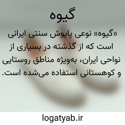 نوعی پاپوش. از رشته های نخی به هم تافته یا پارچه های درهم تابیده درست می شود. زیرۀ گیوه ها معمولاً چرمی است و می تواند پاشنه دار یا بی پاشنه باشد. این پای افزار از قرون میانی شناخته شده است و طبقات مختلف اجتماع آن را می پوشیده اند و مورد استفاده زنان و مردان بوده است. گیوه انواع مختلفی دارد که امروزه مهم ترین آن گیوۀ ملکی و گیوۀ کرمانشاهی است. گیوه های رنگی، ابریشمی، نوک تیز، زیرۀ چرمی و سایر طرح های متنوع هنوز تولید می شود. این گیوه ها بیشتر در آباده، یزد، طبس، کرمانشاه و پاوه دوخته می شود.