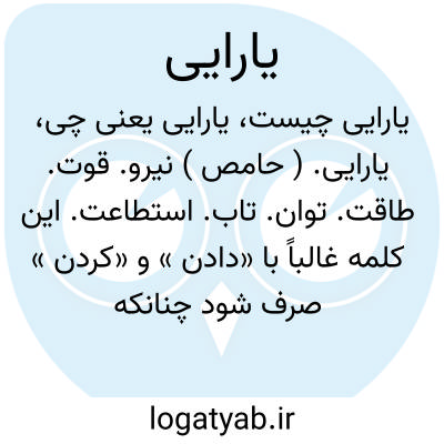 یارایی. ( حامص ) نیرو. قوت. طاقت. توان. تاب. استطاعت. این کلمه غالباً با «دادن » و «کردن » صرف شود چنانکه گویند دلم یارایی نداد. چشمم یارایی نمی کند ببینم. عقلم یارایی نمی کند بفهمم. زورم یارایی نداد بردارم. عمرش یارایی نکرد.