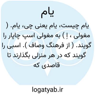 یام. ( مغولی، اِ ) به مغولی اسپ چاپار را گویند. ( از فرهنگ وصاف ). اسبی را گویند که در هر منزلی بگذارند تا قاصدی که به سرعت رود بر آن سوار شود تا منزل دیگر. ( برهان ). اسبی که در راههای دور در هر منزلی گذارند تا رونده سوار شود و خبر به منزل برساند و به ترکی آن منزل را چاپارخانه خوانند. ( آنندراج ) ( انجمن آرا ). اسب پست. ( ناظم الاطباء ): آنچ ناقص باشد و از یامها کم گشته باز از رعیت عوض گیرند. ( جهانگشای جوینی ). و ترتیب یام و اولاغ و علوفات ضجرت نکنند. ( جهانگشای جوینی ). استخراج لشکر و یام و اخراجات و علوفات خارج از مال. ( جهانگشای جوینی ). آنچ از این وجه حاصل شود در وجه اخراجات حشر و یام و خرج ایلچیان صرف کند. ( جهانگشای جوینی ). و سال به سال عرض یامها نکنند. ( جهانگشای جوینی ).این زمان پسرش یکه فنچان بجای او نشسته است و دیوان یامها بسیار میداند. ( جامع التواریخ رشیدی ص 531 ).