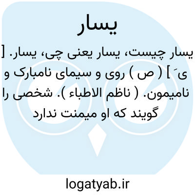 (اسم ) ۱- توانگری استطاعت. ۲- جانب چپ. ۳- دست چپ. ۴- فارسیان بمعنی شوم ونامبارک استعمال نمایند: نشتسه مدعیانند ازیمین ویسار خدای را که بپرهیز ازیساری چند. ( نورالدین ظهوری )