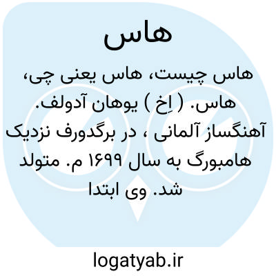 هاس. ( اِخ ) یوهان آدولف. آهنگساز آلمانی، در برگدورف نزدیک هامبورگ به سال 1699 م. متولد شد. وی ابتدا خواننده یک اپرای سیار بود، بعداً به خوانندگی در تأتر پرداخت و سپس برای تکمیل تحصیلات خود در رشته موسیقی به ایتالیا رفت. در ونیز چندین اپرا ساخت که بوسیله خواننده های مشهور ایتالیا فارینلی و سینیورا تزی اجرا شد و بتدریج شهرت وی بالا گرفت. هاس مسافرتهائی به بعضی از کشورهای اروپائی کردو آهنگهای خود را به گوش دوستداران خود رسانید. سرانجام در دسامبر 1783 م. در ونیز وفات یافت. وی در طول زندگی هنری خود در حدود 120 اپرا و بسیاری آهنگهای دیگر خلق کرده است. ( از دایرةالمعارف بریتانیکا ).