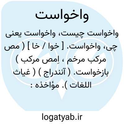 (مصدر اسم ) ۱ - باز خواست اعتراض: (( جز این با منت هیچ وا خواست نیست که دیک ترازو دو من راست نیست. ) ) ( نظامی ) ۲ - اعتراض صاحب سند یا برات کش بهنگامی که برات نکول شود و یا از پرداخت آن خود داری گردد.