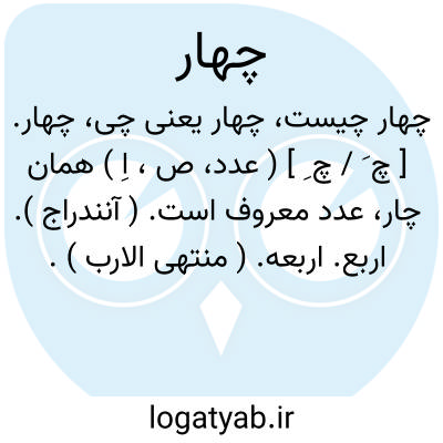 چهار. [ چ َ / چ ِ ] ( عدد، ص، اِ ) همان چار، عدد معروف است. ( آنندراج ). اربع. اربعه. ( منتهی الارب ). عدد اصلی میان سه و پنج،دو برابر دو. شمار میان سه و پنج، دودو. این کلمه با یونانی آن تترا از یک اصل است و شاید چهار اصل تترا باشد. علامت آن «4» است و نیز با تسارون یونانی شاید هم ریشه باشد. نماینده آن در ارقام هندیه «4» و در حساب جمل «د» باشد. ( یادداشت مؤلف ):