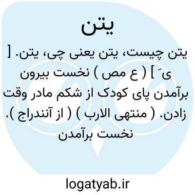 یتن. [ ی َ ] ( ع مص ) نخست بیرون برآمدن پای کودک از شکم مادر وقت زادن. ( منتهی الارب ) ( از آنندراج ). نخست برآمدن پای کودک از شکم مادر پیش از سر آن. یقال: خرج یتناً. ( ناظم الاطباء ). || ( ص ) بچه که برعکس معمول تولد شود یعنی اول پای او بیرون آید. ( غیاث اللغات ). کودک که نگونسار زاید. ( دهار ) ( مهذب الاسماء ).
