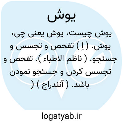 یوش. ( اِ ) تفحص و تجسس و جستجو. ( ناظم الاطباء ). تفحص و تجسس کردن و جستجو نمودن باشد. ( آنندراج ) ( برهان ). جستن و تفحص نمودن و پژوهش کردن است و آن را یوز نیز گویند. ( فرهنگ جهانگیری ). و رجوع به یوز شود. || شکار و صیادی. ( ناظم الاطباء ).