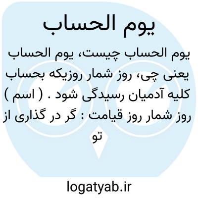(ادیان): روز قیامت، روز شمار. یا رب از فضل و کَرَم عطار را بیدار کن/ تا به بیداری شود در خواب تا یوم‌الحساب. «عطار‌نیشابوری»