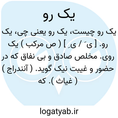 یکروی: کنایه ا ش ص بی ریاومخلص، ضددورو، کسی که ظاهروباطنش یکی باشد، یکرویه نیزگویند